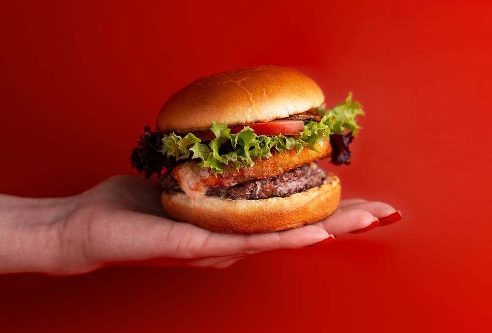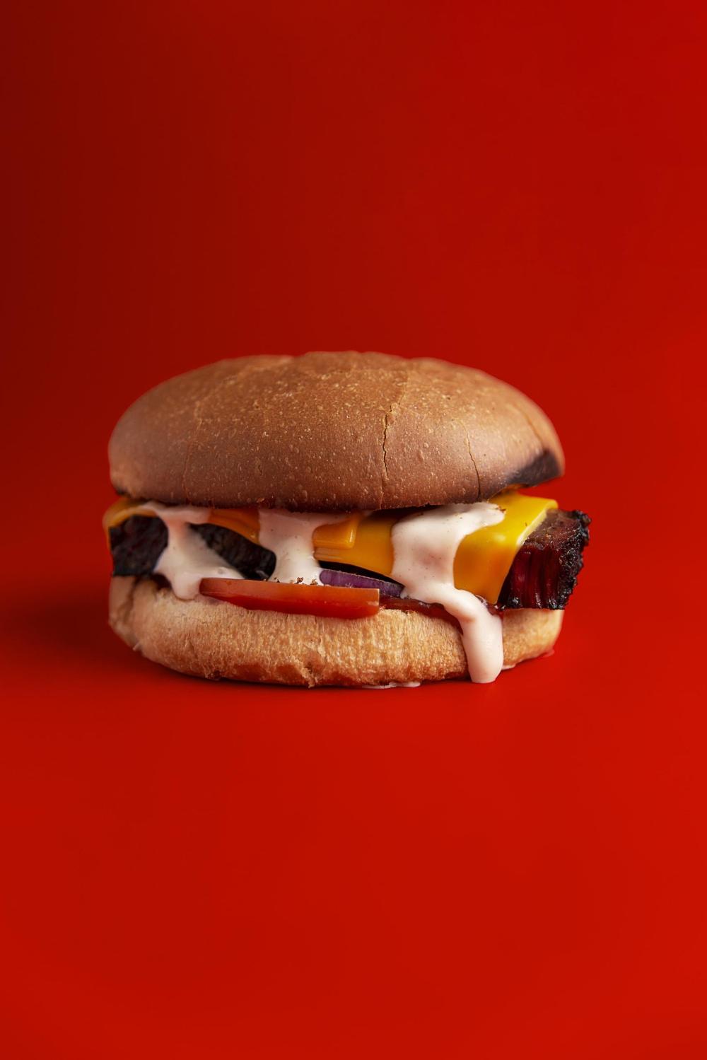 Бургер с брискетом: Мощный вкус мяса в сочетании с мягкой булкой и авторским соусом.