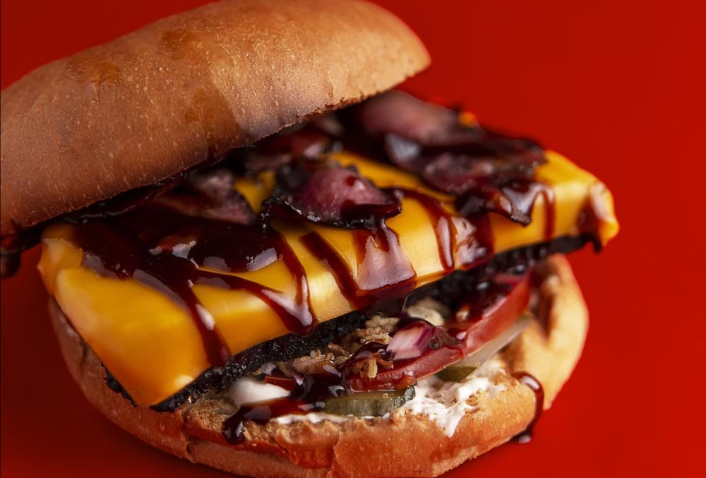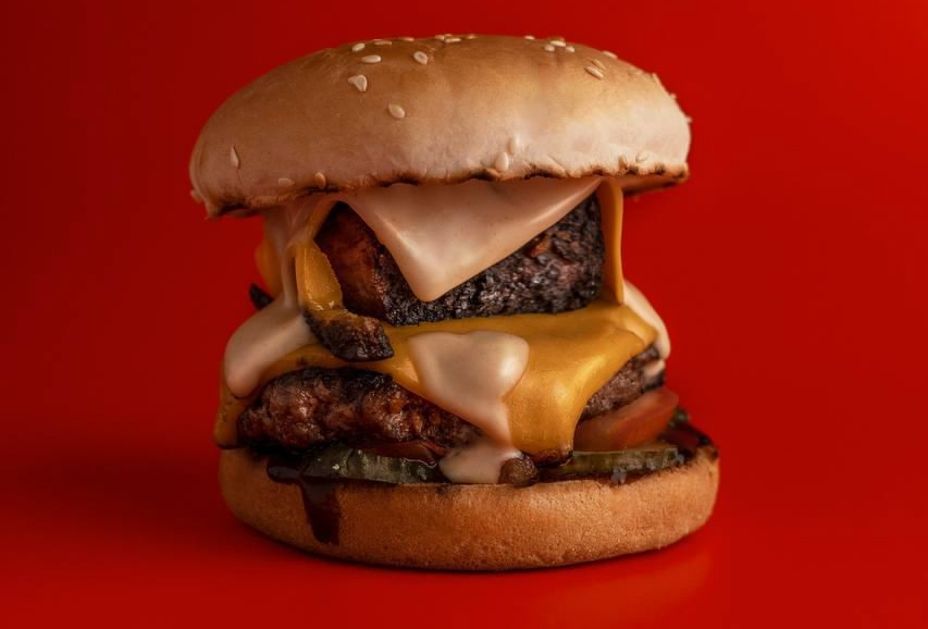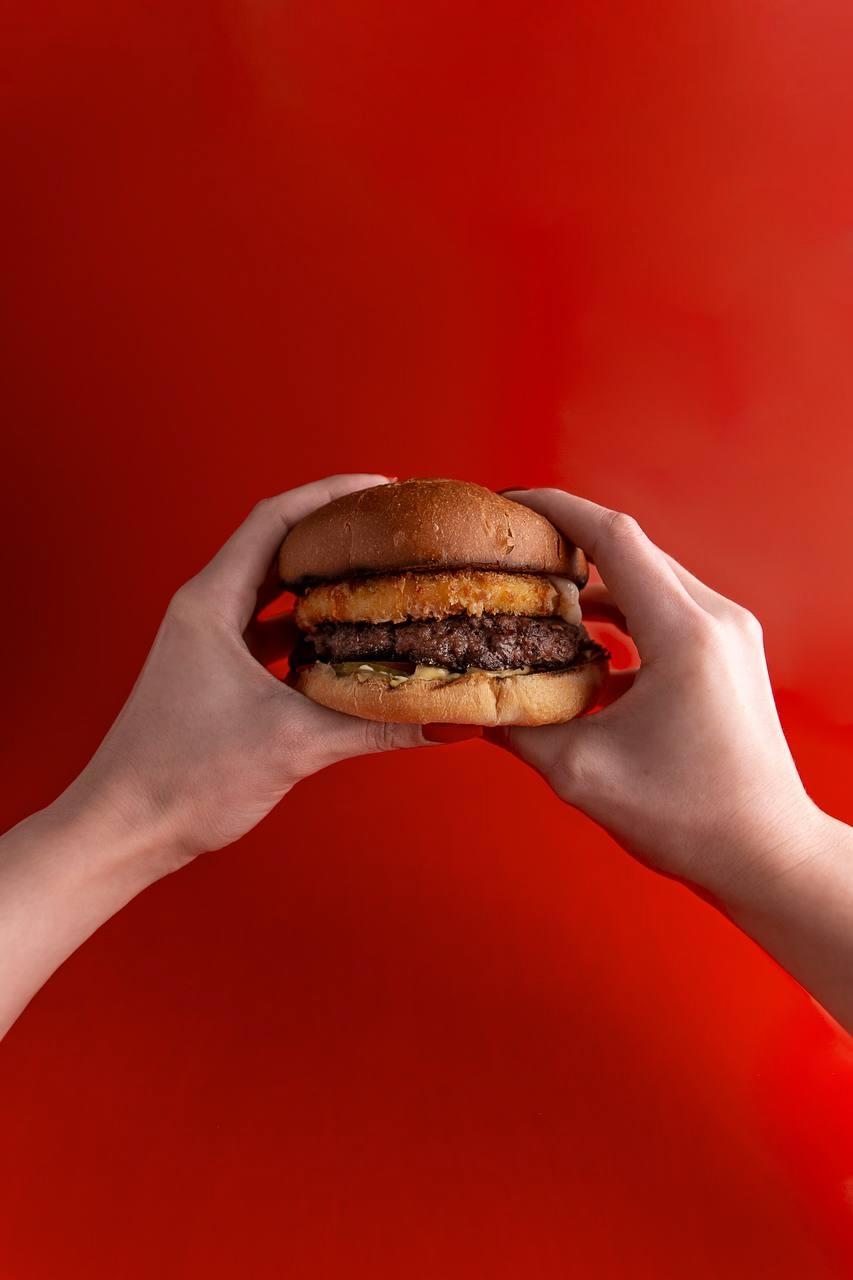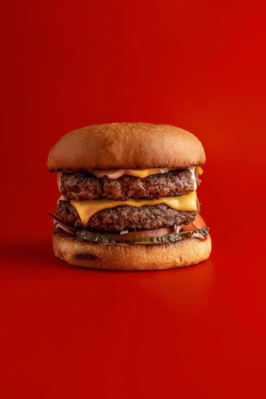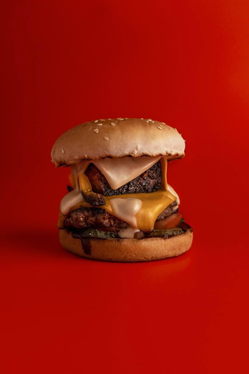 Две сочные большие мраморные котлеты в сочетании с фирменными соусами, сыром чеддер и овощами.