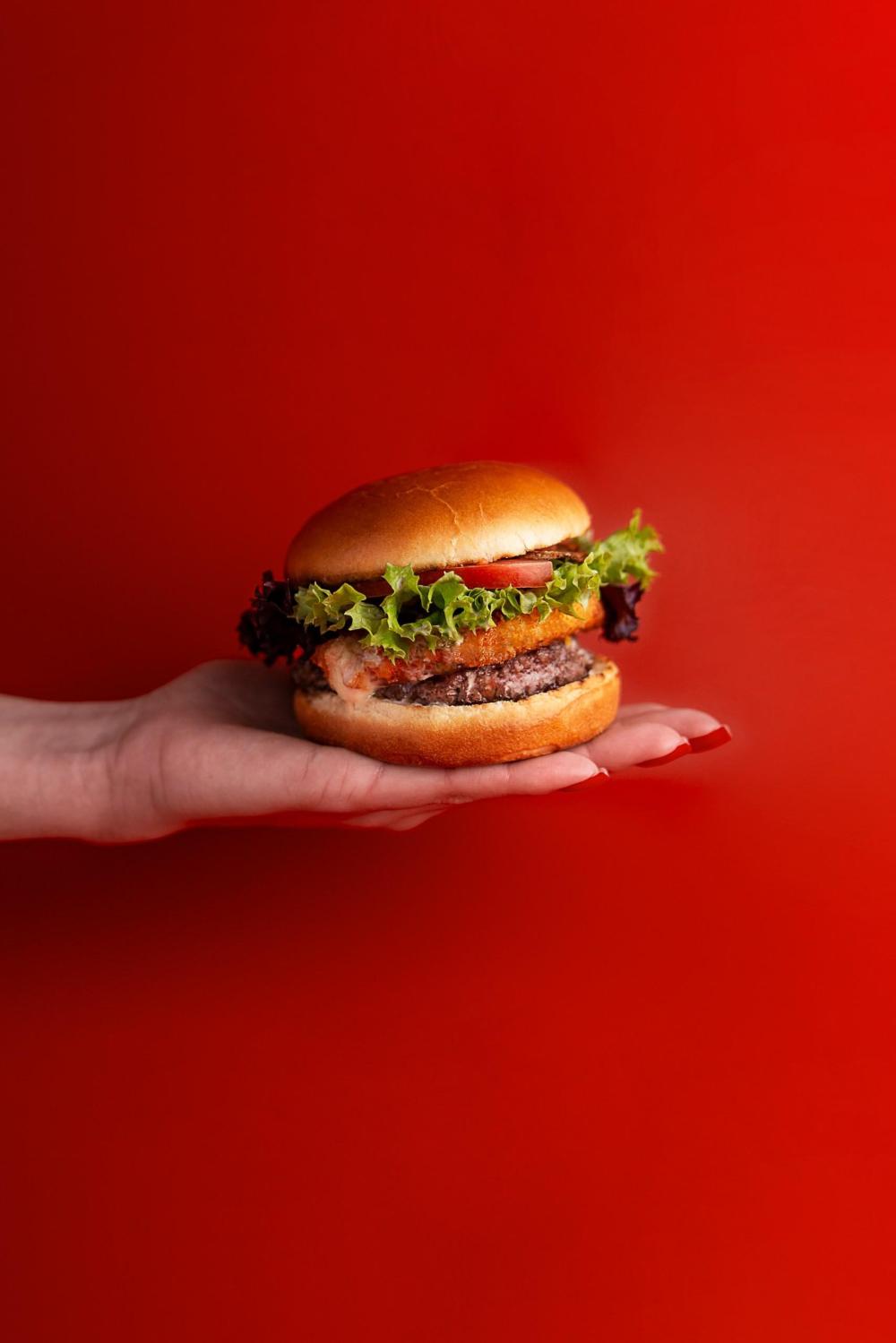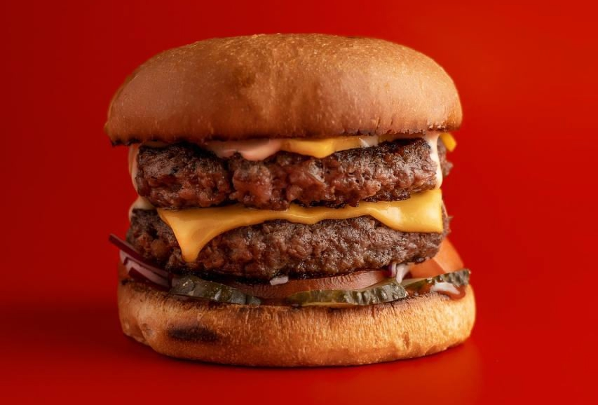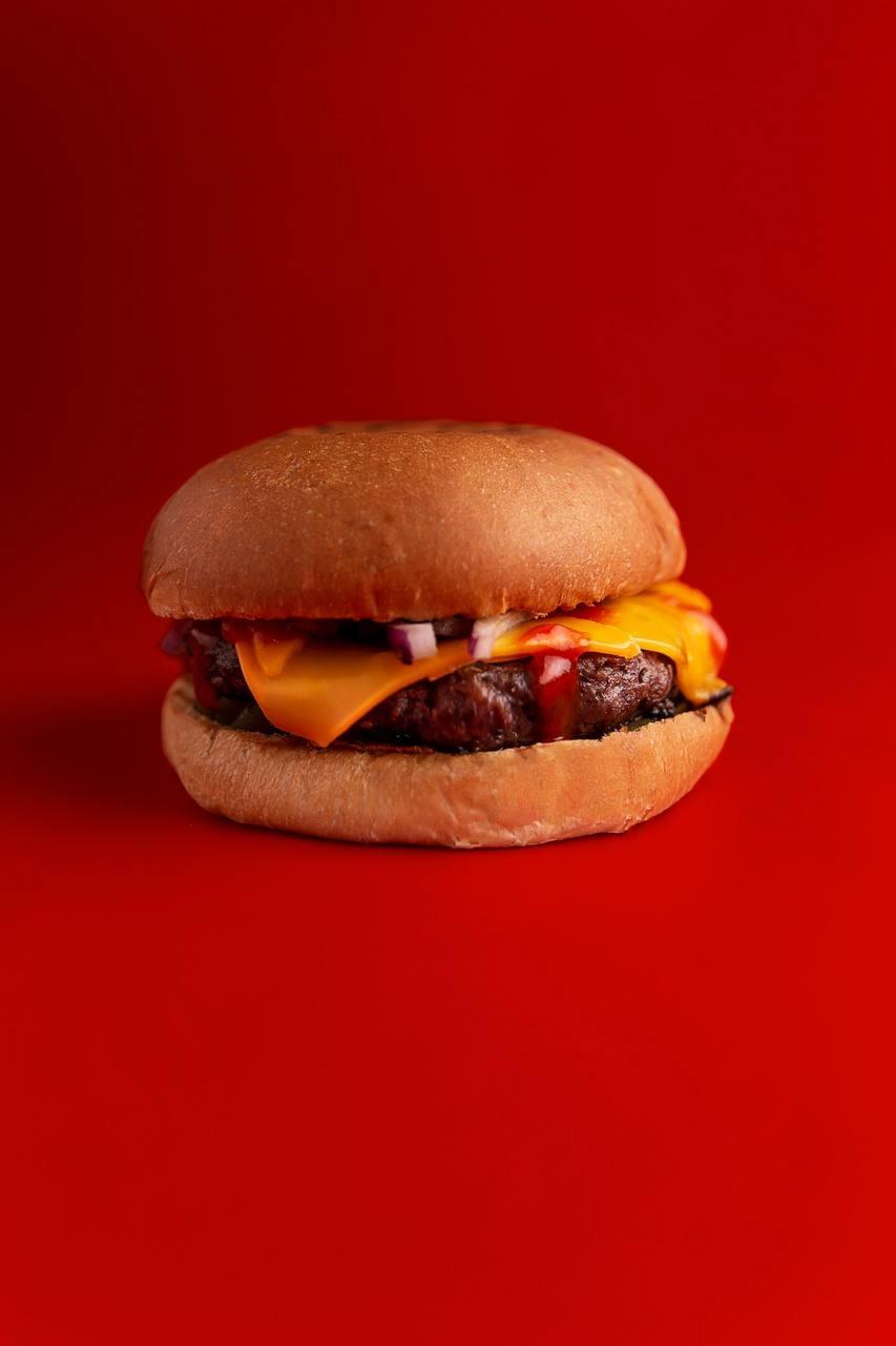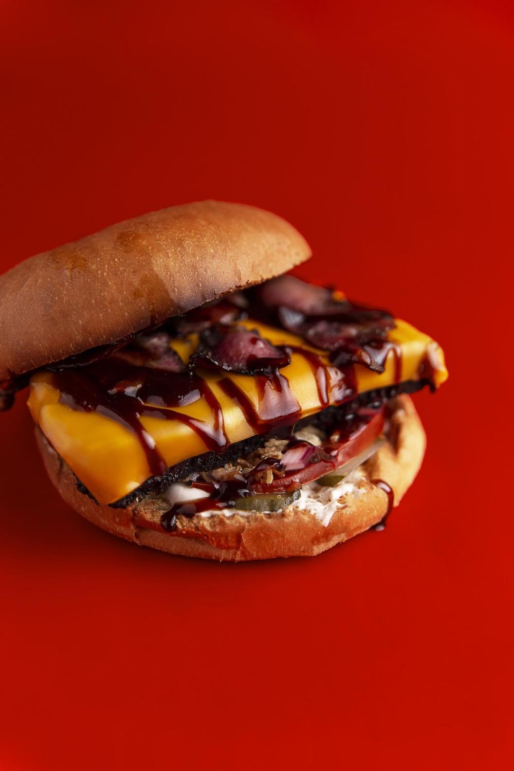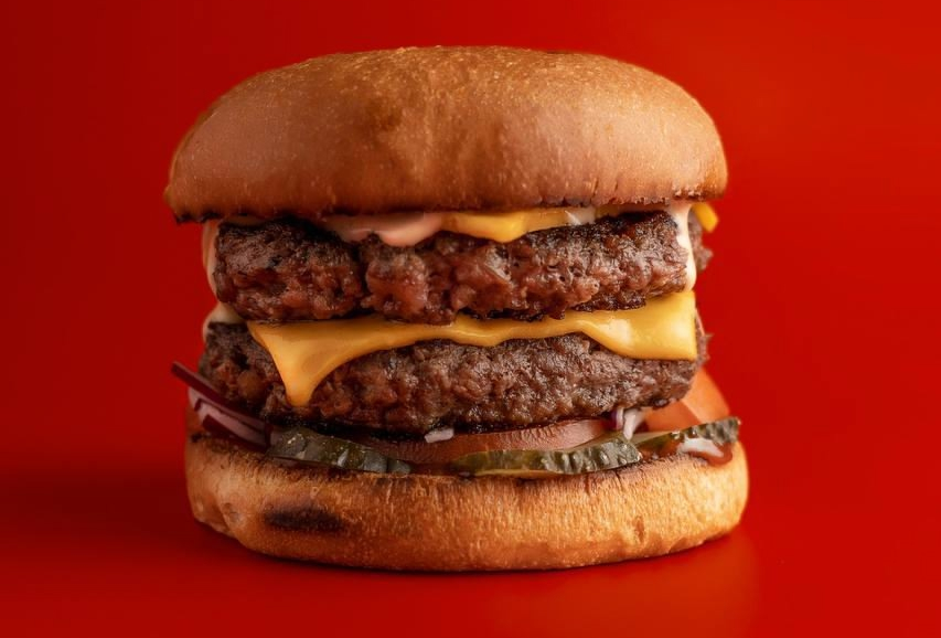 Две сочные большие мраморные котлеты в сочетании с фирменными соусами, сыром чеддер и овощами.