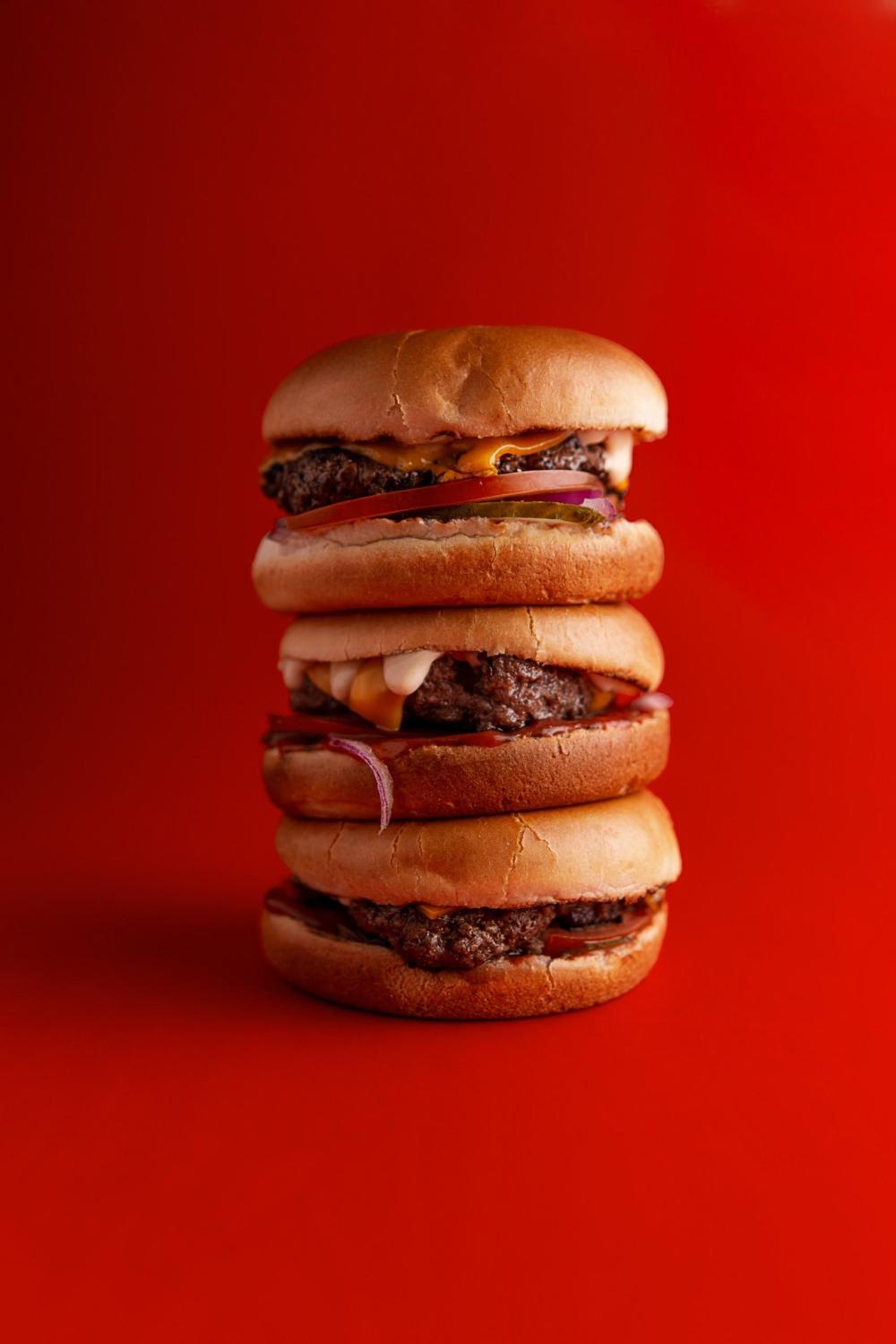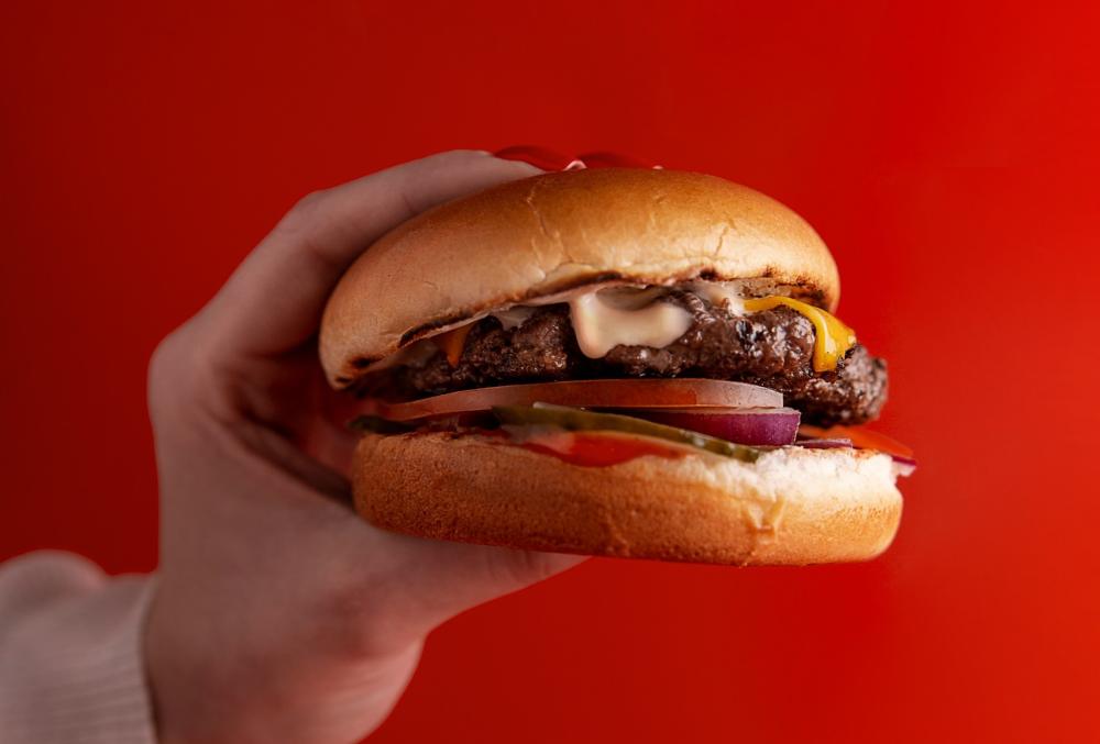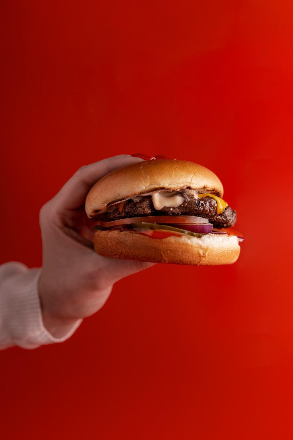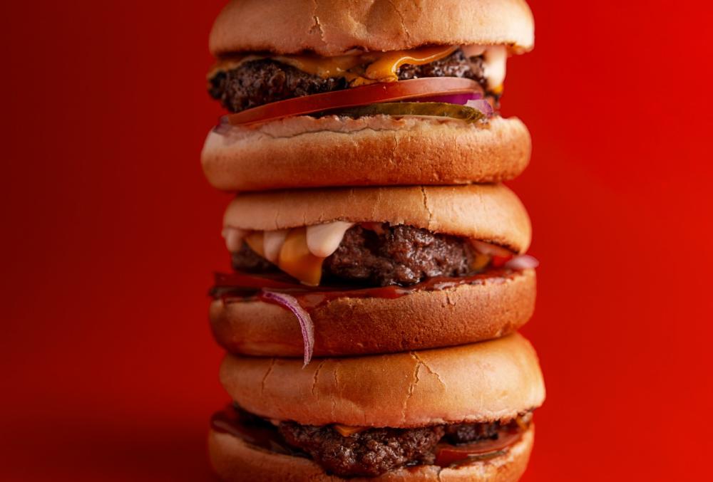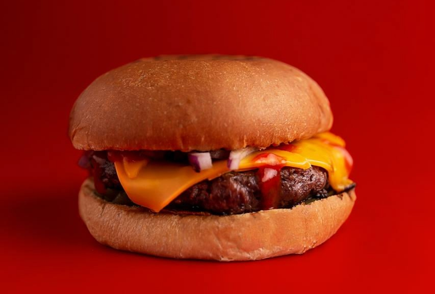 Две сочные большие мраморные котлеты в сочетании с фирменными соусами, сыром чеддер и овощами.