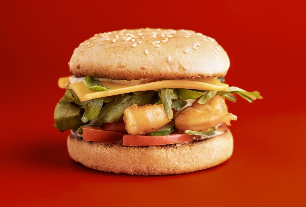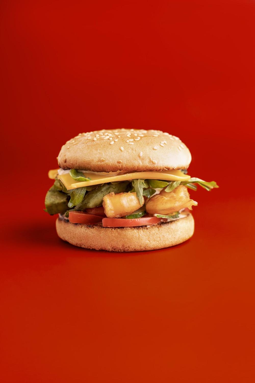 Бургер с креветкой, рукколлой и соусом манго-чили. Лучшее сочетание для любителей морепродуктов.