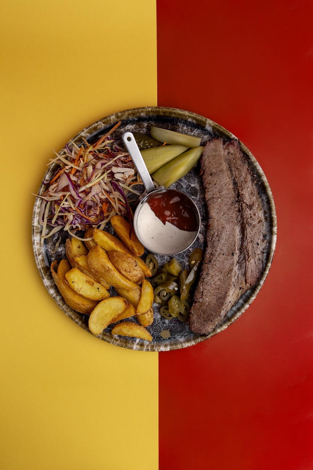 Основной ингридиент- это мраморная телятина приготовленная по техасски.Технология подразумевает длительное копчение, что важно заметить проходящим дымом, что даёт мясу легкий аромат дыма.Готовится около 12 часов, что делает мясо сочным.