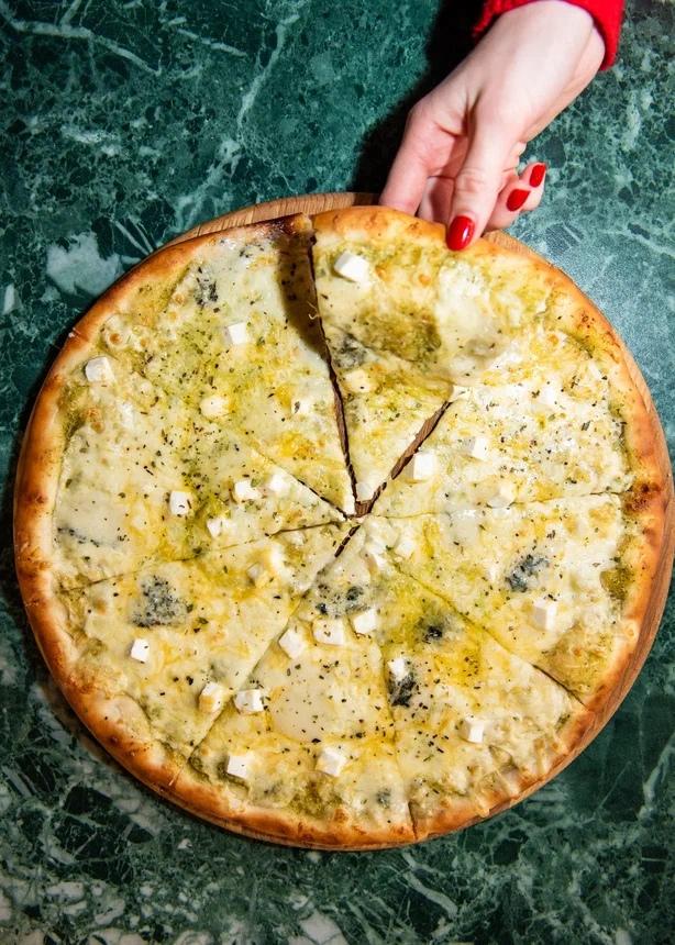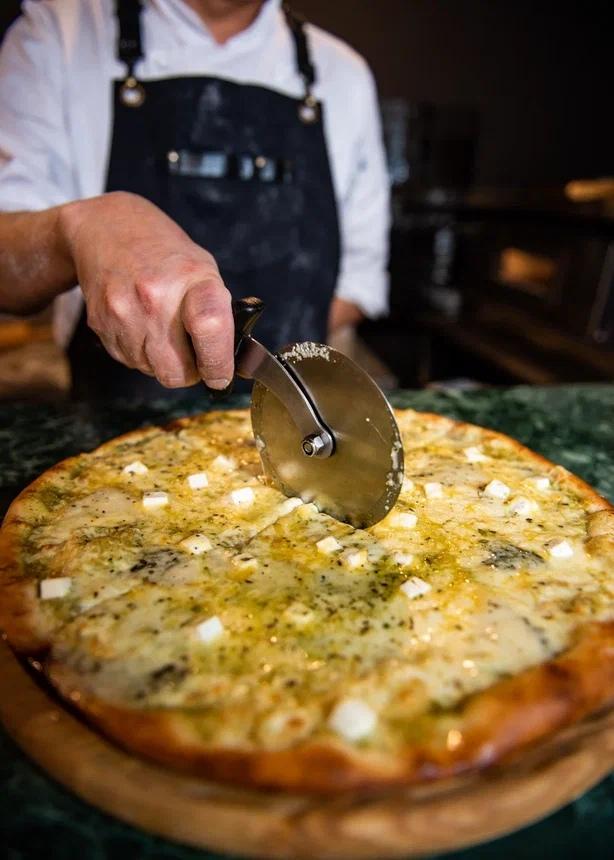 Пицца с брискетом: Уникальный микс тягучего сыра и дымного техасского мяса на тонком тесте.