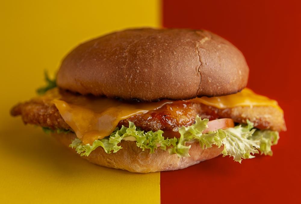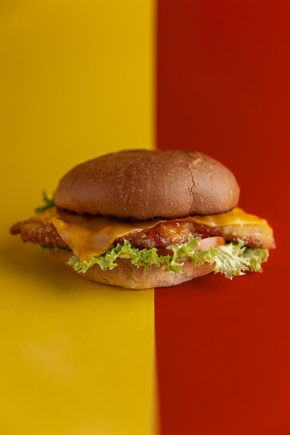 Сочная мраморная котлета в сочетании с фирменными соусами, сыром чеддер и овощами.