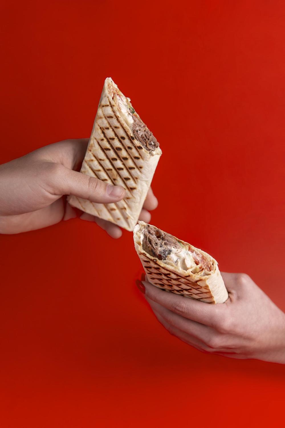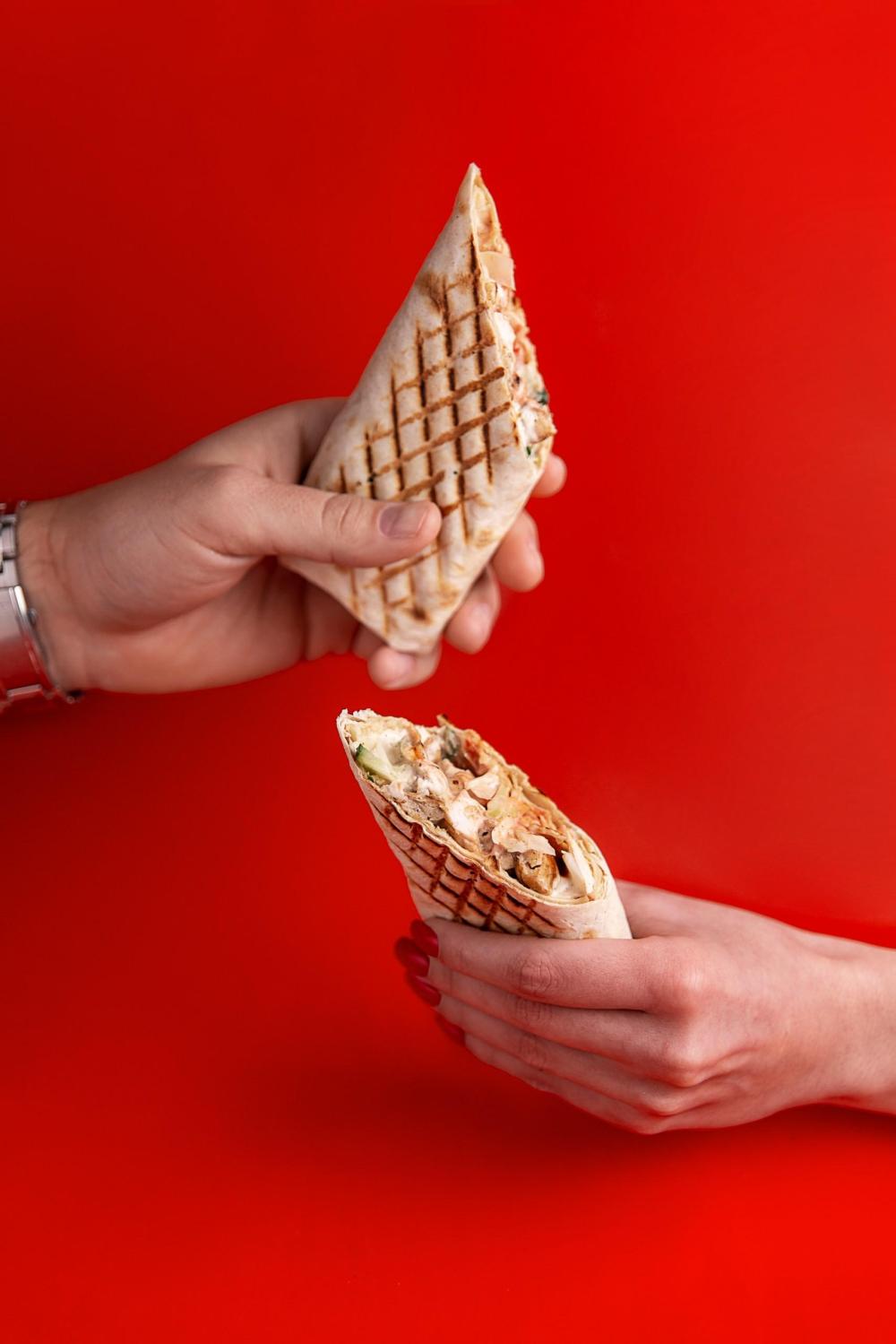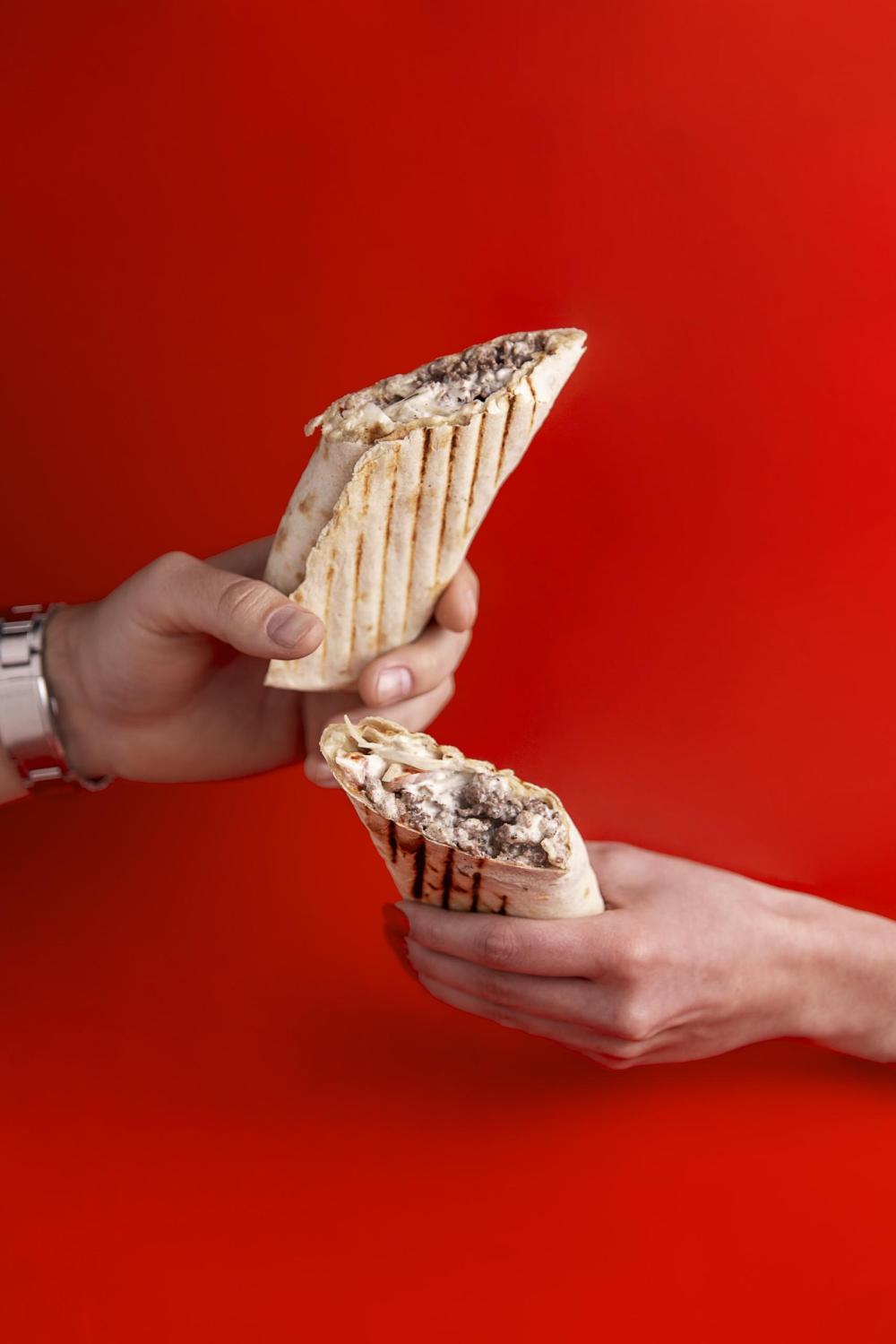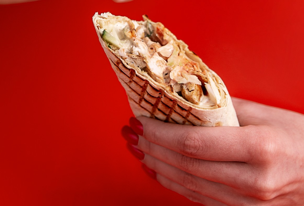 Куриная шаурма, два вида фирменного соуса, свежий помидор, огурец свежий, капуста.