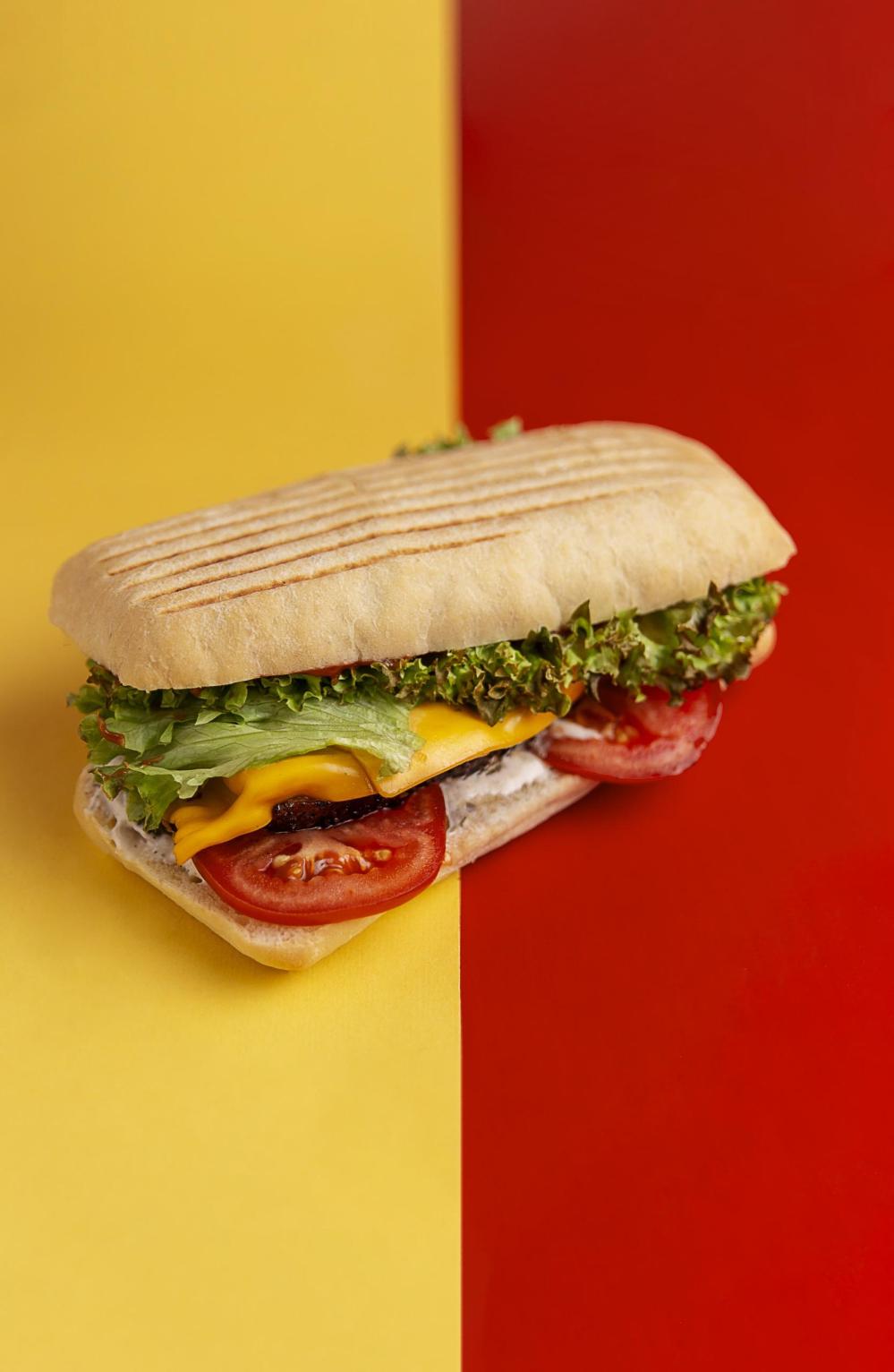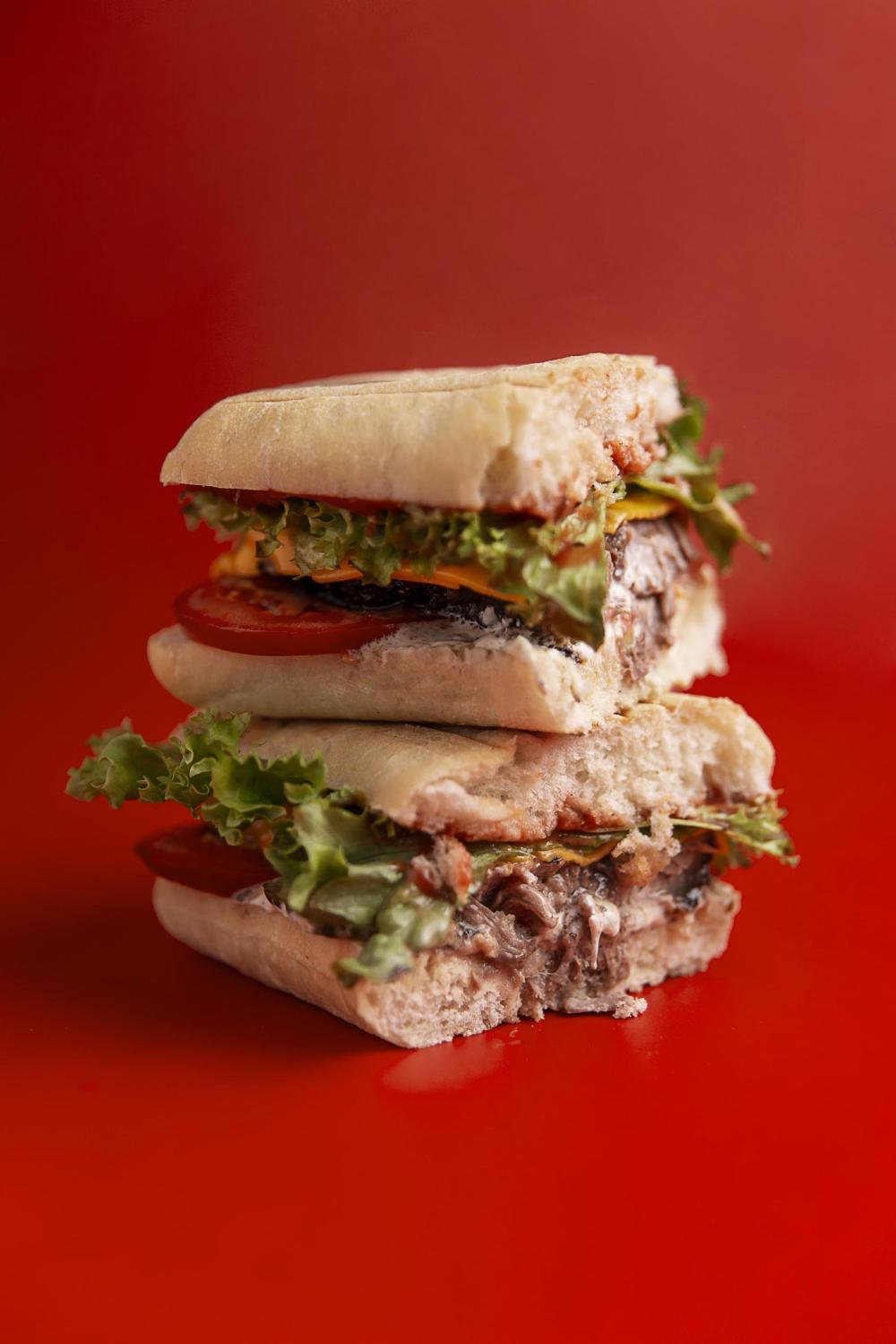Хрустящий тост,сочный брискет, помидор, сыр Чеддер,красный соус, белый соус,песто, огурец маринованный.